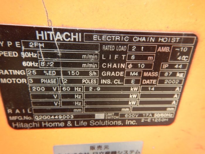 日立 モートルブロック 2t 6m揚程 型式2FH 2000kg チェーン長さ6m 中古品