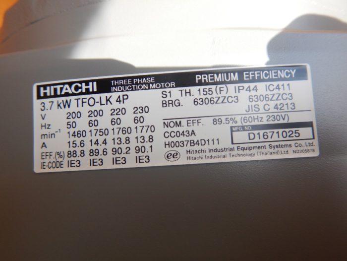 「販売終了いたしました」未使用品 日立 三相モートル 3.7kw TFO-LK 4P 200V 5馬力モーター