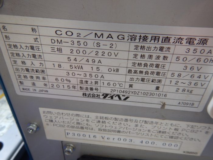 ダイヘン 半自動溶接機 350A DM-350(S-2) 三相200V 入力18.5KVA 15kw 製造2015年 中古品